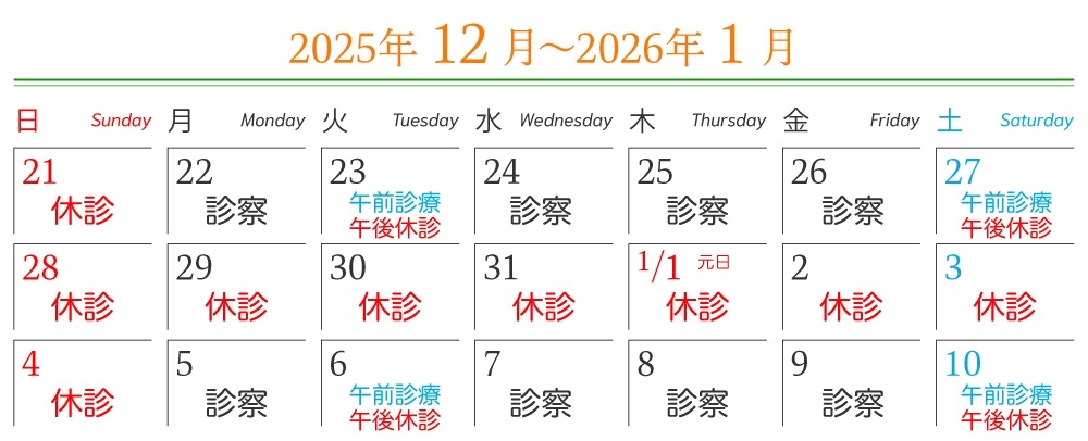 2025年12月28日(日)から2026年1月4日(日)まで年末年始の休診とさせていただきます。